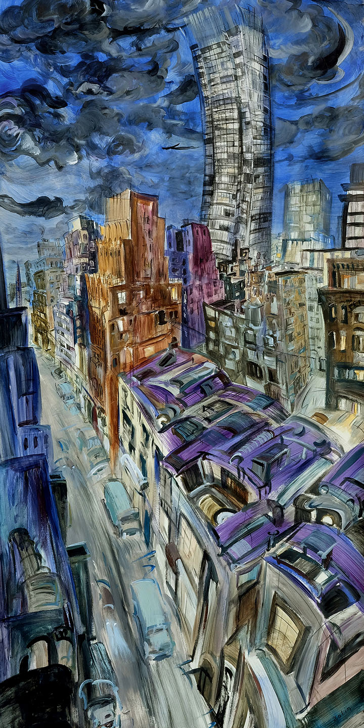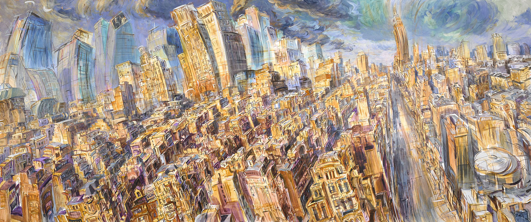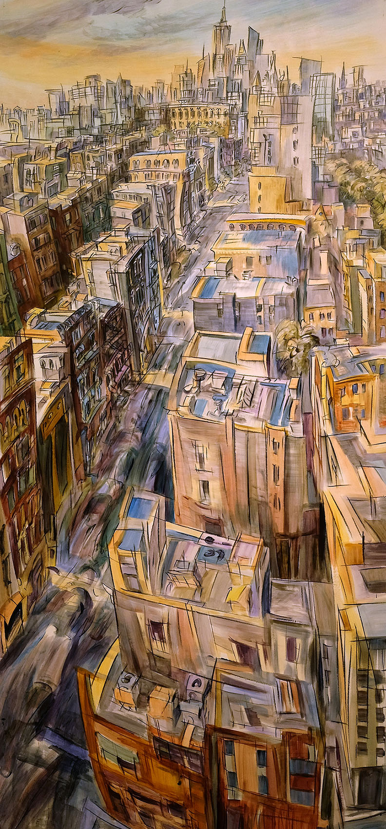 Eight paintings explore the convergence of gestural mark-making with curved space, using cityscape imagery, often from New York.