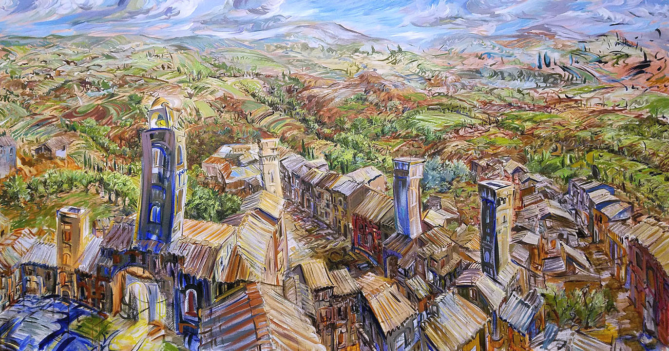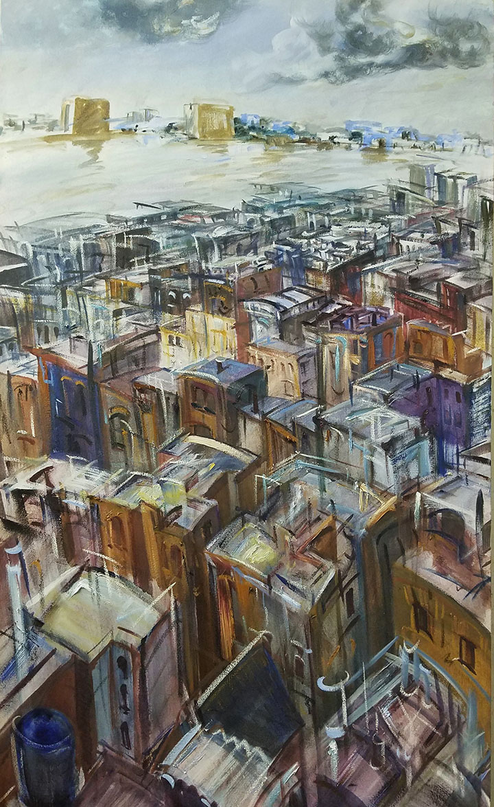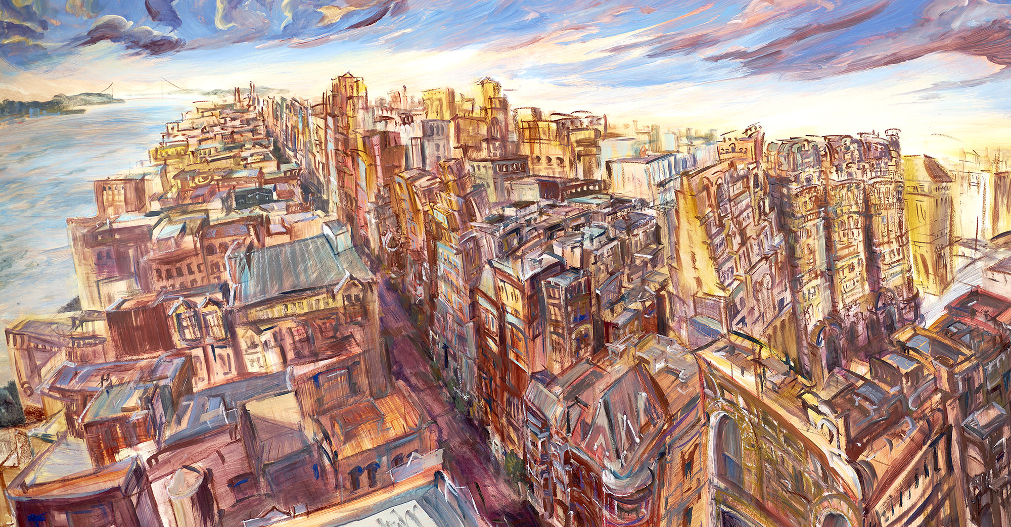Eight paintings explore the convergence of gestural mark-making with curved space, using cityscape imagery, often from New York.